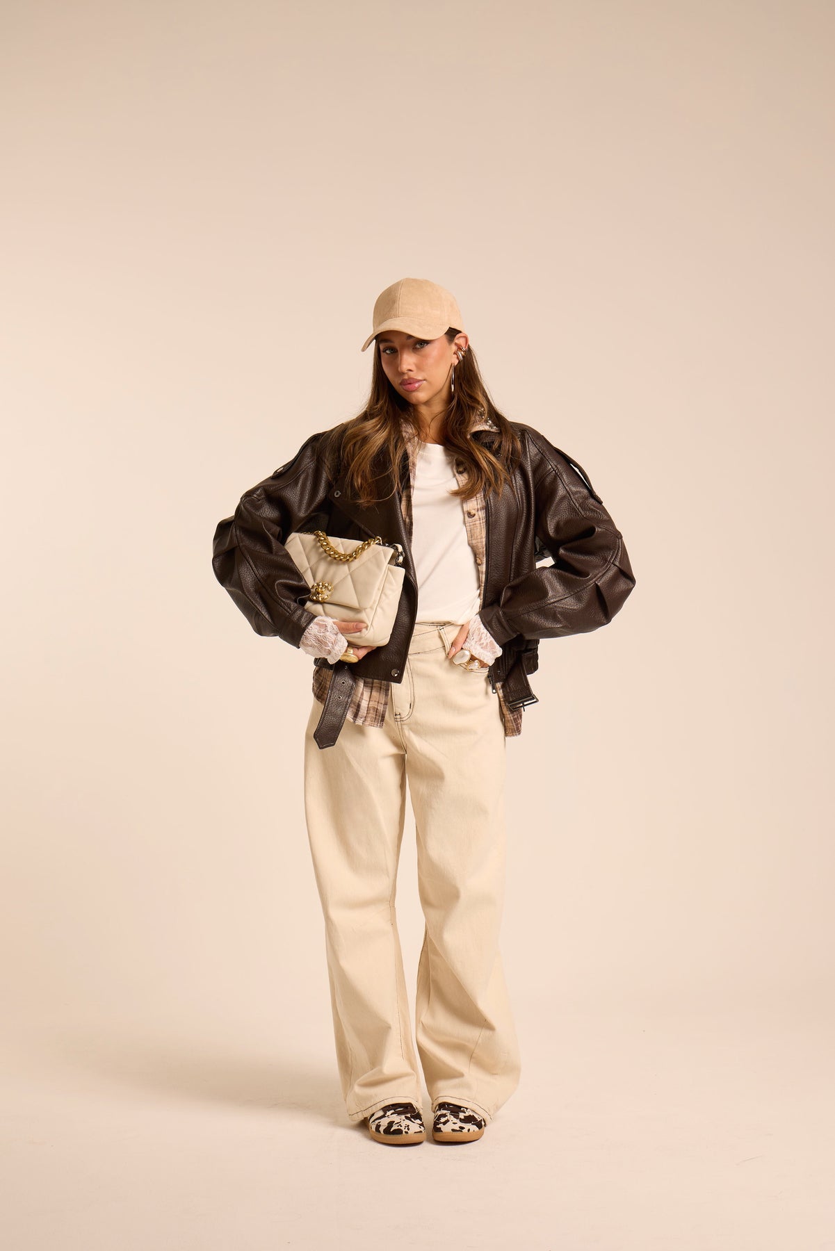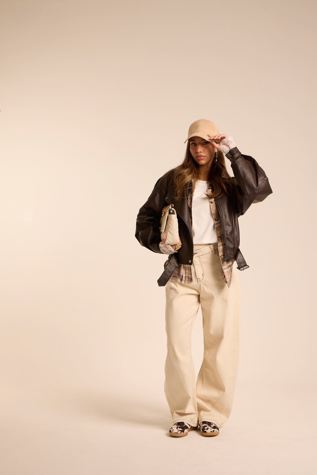 This oversized Rockin Faux Leather Jacket offers a bold and stylish look with a faux leather finish that adds a touch of modern sophistication. Fully lined for comfort, the jacket features double collars and buckle details that elevate its edgy design.