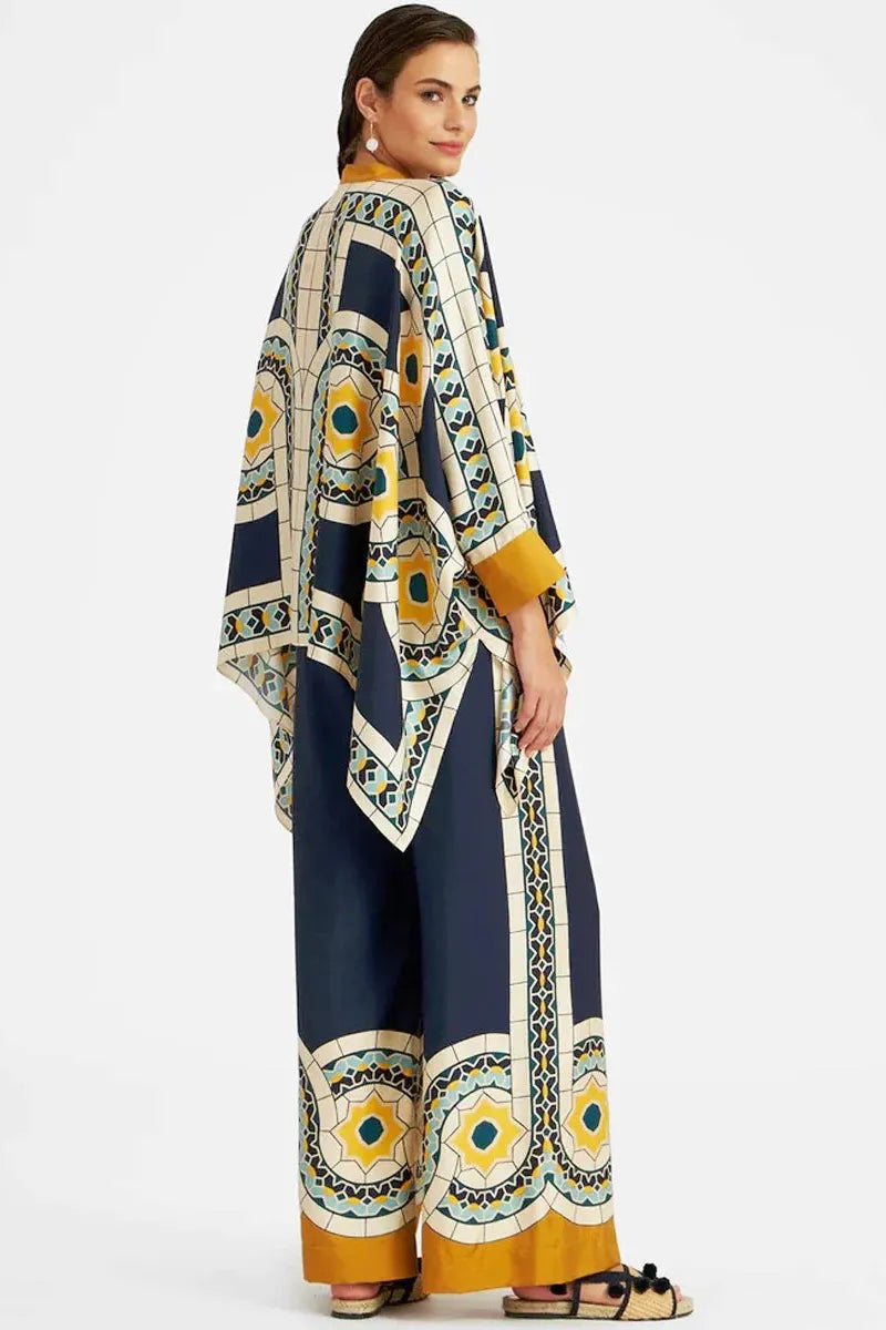 Step into radiant elegance with the Celeste Satin Floral Set, a vibrant fusion of golden yellow and deep blue hues that exudes both confidence and sophistication. Crafted from luxurious satin, this two-piece ensemble features a flowy batwing-sleeve blouse and graceful wide-leg pants, offering a silky-smooth feel and a stunning drape. The striking floral print adds a touch of artistic beauty, making this set a true standout for any occasion that calls for effortless glamour.